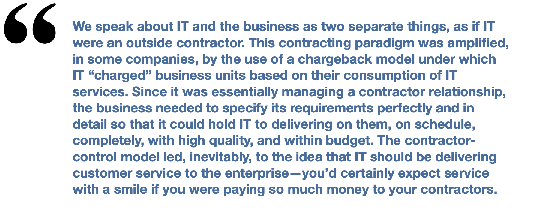 This quote from Mark Schwartz suggests that traditional IT Leadership is about delivering a service to a set of requirements – implicit or explicit – to a customer (the ‘business’) who holds IT to account and who are often dissatisfied with the result.